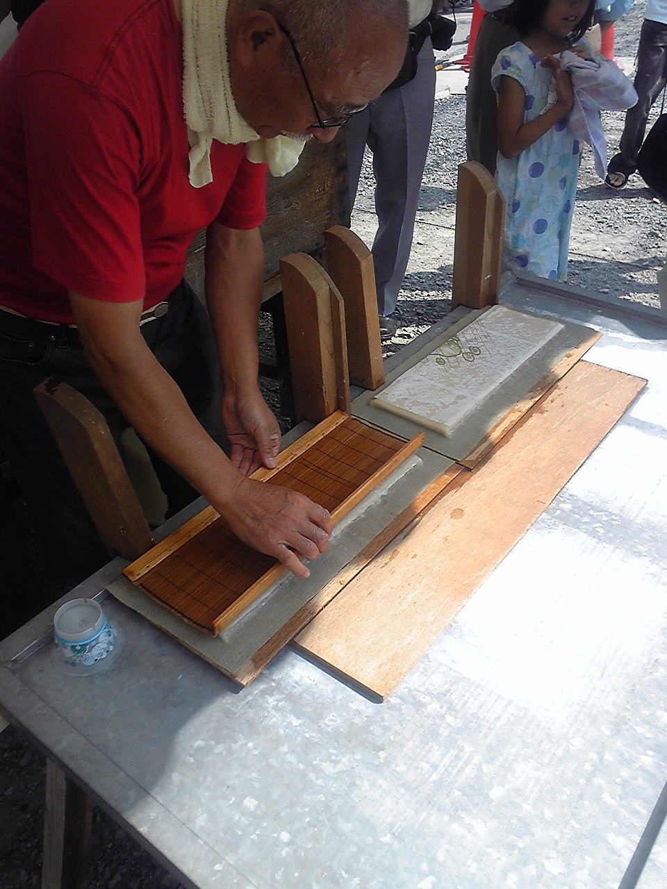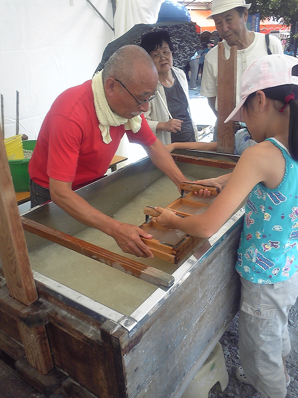 久しぶりの更新で申し訳ありません・・・。9月6日、白糸の滝で開催されました「富士の巻き狩り祭」でのイベント、手漉き和紙体験に参加してきました。これは、地元芝川の手漉き和紙職人・内藤恒雄さん主催の「駿河半紙技術研究会」によるもので、Riheiもこの研究会に属しておりスタッフとして参加しました。地元の職人さんによって受け継がれる「手漉き」という技術を、子供たちをはじめ、一人でも多くの人々に体験をしてもらい、紙とはこうしてできるものなんだというのを知ってもらいたい、ということを目的として開催しています。残暑の暑い日差しが残る中、たくさんの方々に体験をしてもらいました。