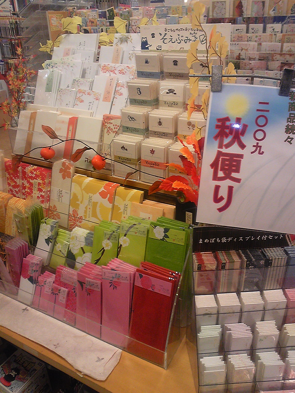 秋を感じる便箋や封筒、一筆箋、はがき箋などに加え、和風のかわいいポチ袋や、絵柄豊富な「そえぶみ箋」も取り揃えています。春や夏に比べ、秋便りのコーナーは期間が短いので、ぜひお早めにお買い求めください。今年の秋の夜長は、「手紙」を楽しんではいかがですか?